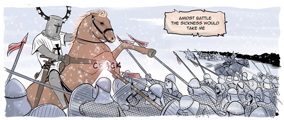 There were a few discussions about size of weapons and helms. Too small or too large for accuracy versus too small or large for dramatic affect. I think we struck a good balance. However, the biggest problem was the grand, red, Malbork Castle, which (and I may whisper here) isn’t actually red in the comic. Yes, I know and I’m very sorry. A missed opportunity but the reasons were pretty overwhelming. The illustrator (James Evans) and I decided early on that a good way to help the reader instantly distinguish between the interchanging medieval and modern stories was to have different and distinct colour palettes for each. The training camp and army feel of the modern story was given earthy greens and browns whilst the colder and more severe medieval story was given a much bluer palette. This also helped James with the work load somewhat, as he was pencilling, inking and colouring the 22 pages himself. The problem came when James tried to put a red/orange castle in the blue/icy medieval landscape. It looked really out of place in the colour scheme and no amount of tweaking helped. I again apologise to the UNESCO world heritage site that is Malbork Castle. In my mind it is red. It’s just covered in a layer of frost. Despite these issues I hope it’s an interesting look into some aspects of the Knights of Cademus. James and I really enjoyed working on it with the other Unseen Shadow’ers, especially Nic Wilkinson, Sara Westrop and of course Barry Nugent.