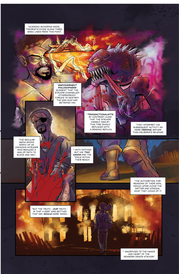 Eye of Stone itself is designed both to shine a light on Napoleon and to preserve the central mystery he represents. I wanted to get inside the character’s workings a bit, but to emphasise the way his very existence informs the world he operates in. The Broken Heart’s predisposition toward the search for “saviours” made them a good fit for the one-shot, and having them find a relic of the Demon Stalker’s former life seemed like a strong frame for a story about his origins to hang in. At the same time, it provided an opportunity to demonstrate the sheer weight of the man’s influence in the radical upheaval a single encounter with him brings. The Children of the Heart fall and the Broken Heart is born.