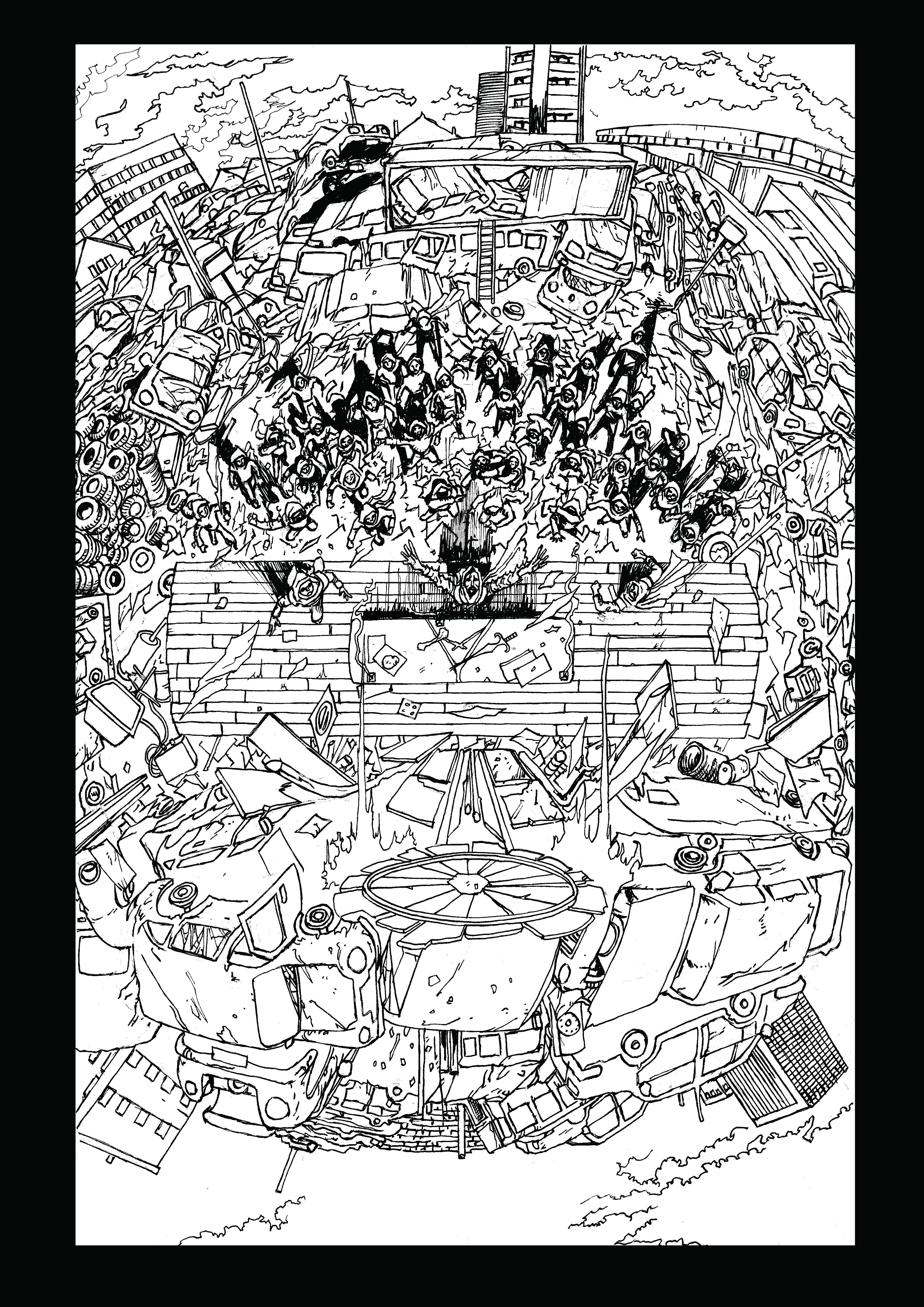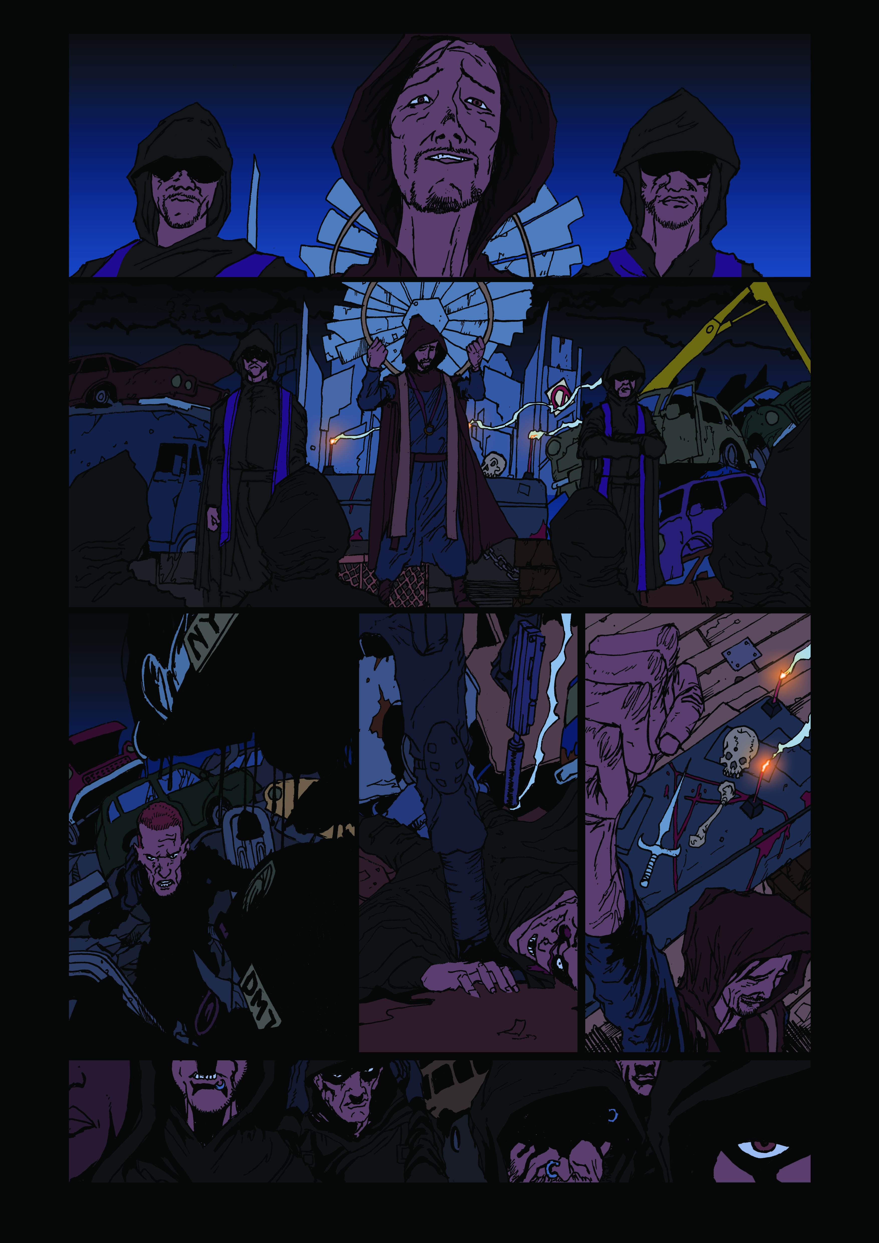 In the same manner as page 1 here’s is a look at the inks for page 2 of our first ever full length graphic novel Blood Cries Out and as you can see our hooded friends are up to some dark mischief in a junkyard. Look out for the finished page next week!